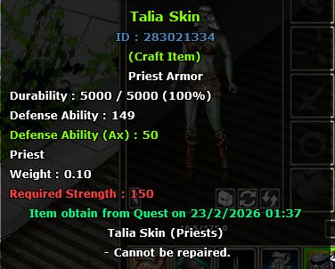 NOT: Priest Talia'nın 150 STR gereksinimi vardır. Mage Talia'nın 150 HP gereksinimi vardır.